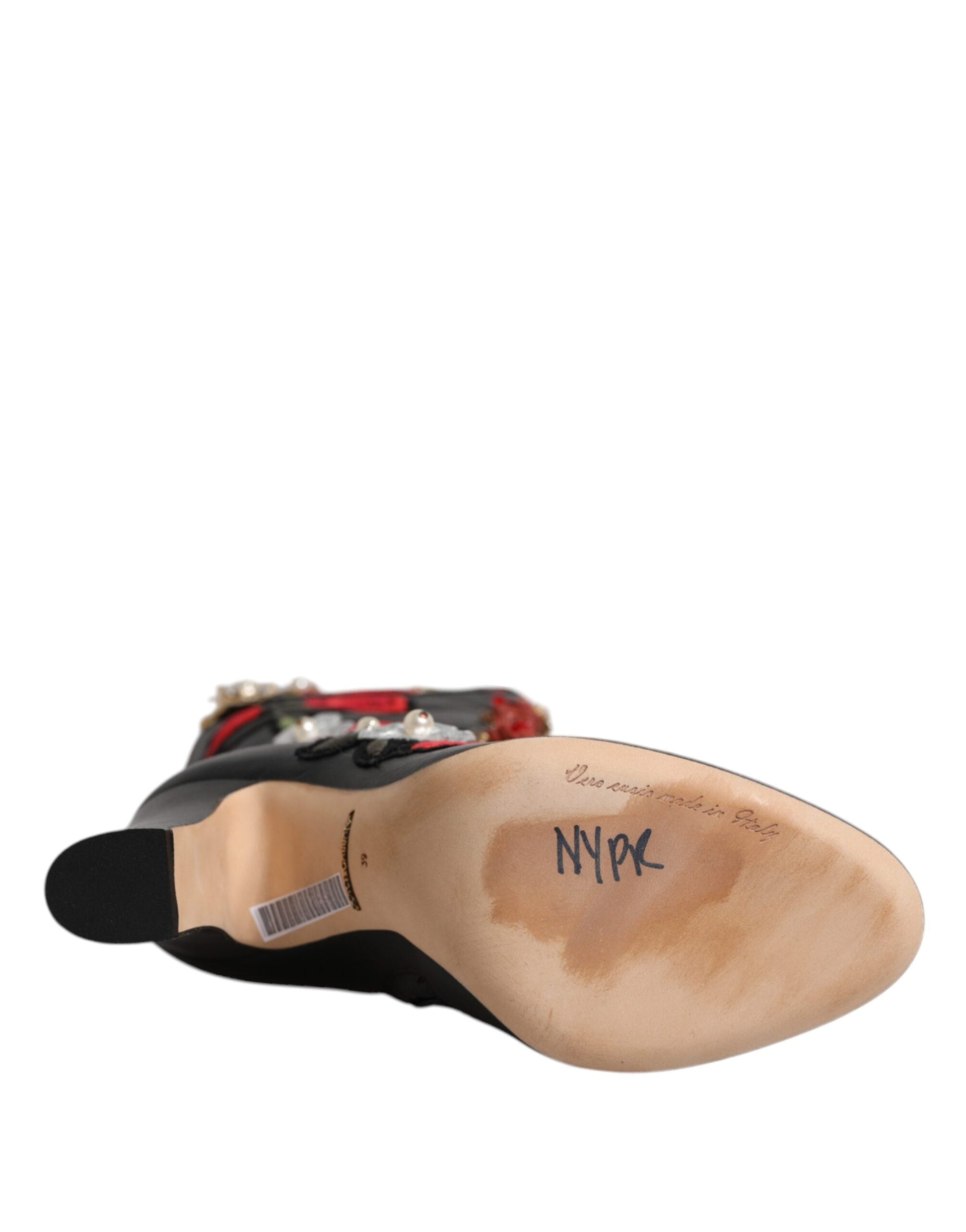Dolce & Gabbana Black Roses Embellished Leather Heel Boots Shoes